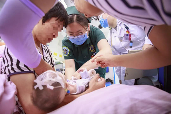 上午10點(diǎn),接到電話通知后徐州市兒童醫(yī)院120急救分站醫(yī)護(hù)人員立即登車去接病人。