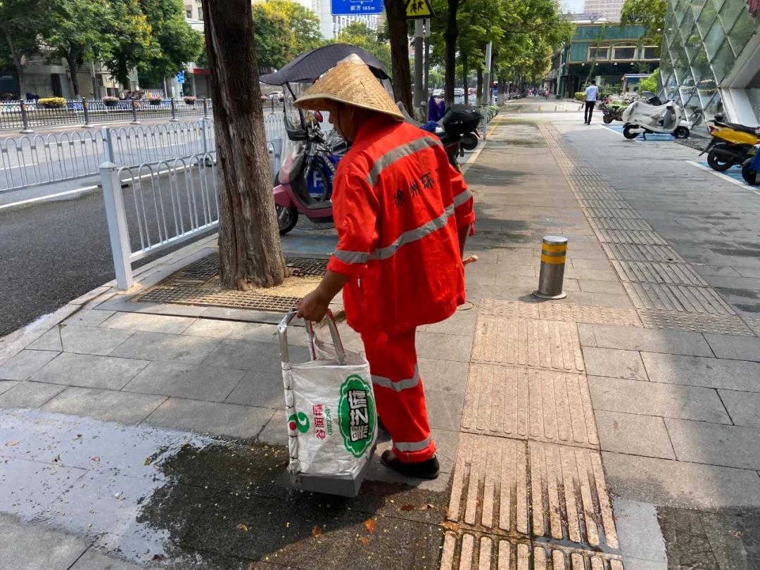 中午12點(diǎn),在中山南路上,穿著橙色工作服、戴大草帽的環(huán)衛(wèi)工人滕紹德穿梭在馬路、人行道上一刻不停地忙碌著。