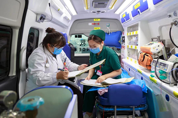 | “等著溫度降下來再上車那是不可能的,在路上走溫度是實(shí)在是烤人。長途還好,在市內(nèi)醫(yī)生護(hù)士一回來都是一身汗,衣服都濕透了,很常見。年輕女大夫身子比較虛,容易暈,在車上硬忍,可能回到醫(yī)院就撐不住了,我們要求兩分鐘就出車,他們一般不會(huì)想自己帶杯水上去的,在車上就是硬撐,時(shí)間短一點(diǎn)還行,時(shí)間長了確實(shí)煎熬得厲害。120大夫必須身體好,稍微差一點(diǎn)就可能撐不下來。” |