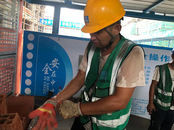 | “一車大概二三百斤,一天要推90到110多車;旧厦刻焖鸵粌商讼聛恚弦聲(huì)濕透了。磚供的差不多的情況下,就送灰。灰烤人,它比較熱,感覺一陣一陣往臉上撲,就火辣辣的那一種。坐下來能歇10分鐘、20分鐘,能晾稍微干一點(diǎn),再推兩車,衣服又濕了。推車子上樓的時(shí)候,手都來不及擦汗,汗會(huì)淌在眼里面,會(huì)很辣眼睛很難受。我們帶著防燙手套,它很厚,時(shí)間長沏的手都是水,下班的時(shí)候手上都是白色的水泡。雖然天氣很熱,但是我要對(duì)得起這份工作,我要有責(zé)任,我要把每一塊磚,安全地送到樓上。對(duì)項(xiàng)目部負(fù)責(zé),對(duì)工地負(fù)責(zé)。” |