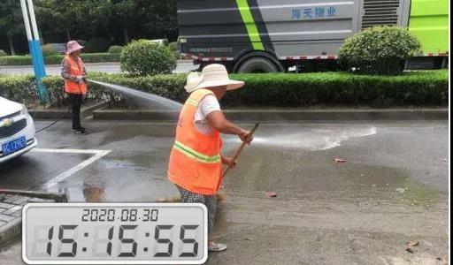 環(huán)衛(wèi)工人緊張作業(yè),用高壓水槍和掃帚清掃人行道以及溝渠垃圾,然后再由灑水車對路面進行整體沖刷,確保道整條路干凈整潔。