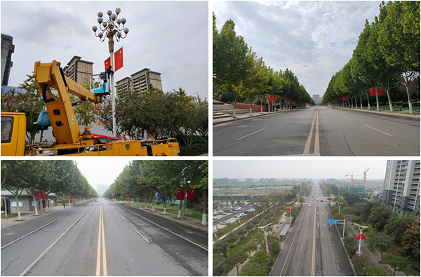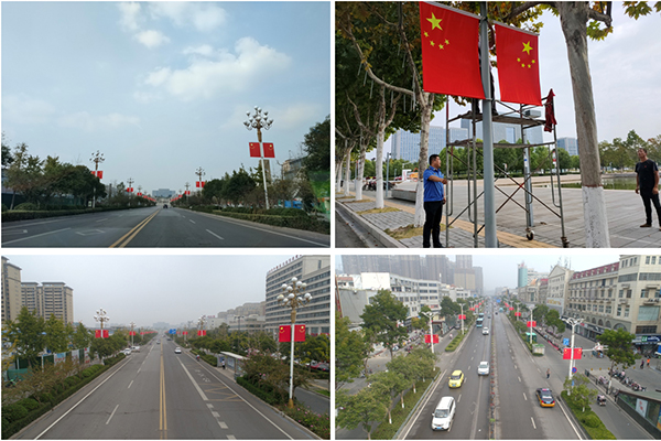 目前,城區(qū)國旗懸掛工作已經(jīng)完成。放眼望去,一面面鮮艷的五星紅旗整齊劃一,一組組美麗的節(jié)日彩燈色彩斑斕,隨著路燈桿的走勢,呈現(xiàn)出一道道靚麗的風景線,將各條街道裝點得靚麗喜慶。