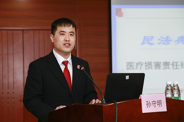 黃淮網(wǎng)  為進(jìn)一步增強(qiáng)廣大醫(yī)務(wù)人員法律意識,保護(hù)醫(yī)務(wù)人員合法權(quán)益,推進(jìn)法治醫(yī)院建設(shè),2021年4月9日,徐州市中級人民法院、徐州市醫(yī)學(xué)會(huì)聯(lián)合舉辦的“送法律知識進(jìn)醫(yī)院”第一站走進(jìn)徐州市兒童醫(yī)院,講座由徐州市醫(yī)學(xué)會(huì)醫(yī)學(xué)鑒定部主任姚遠(yuǎn)主持,徐州市中級人民法院立案一庭專職書記韓華、徐州市兒童醫(yī)院副院長楊秋麗出席并講話,徐州市中級人民法院民一庭三級法官、法學(xué)碩士孫守明作為主講人,兒童醫(yī)院各科醫(yī)護(hù)人員200余人到場聽取。