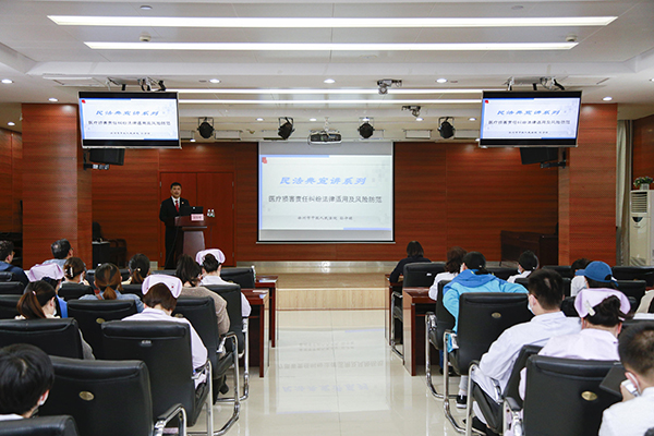 孫法官以“醫(yī)療損害責(zé)任糾紛法律適用及風(fēng)險(xiǎn)防范”為題,以專業(yè)的角度,從法律規(guī)定、審理現(xiàn)狀及特點(diǎn)、常見訴因及風(fēng)險(xiǎn)防范等幾個(gè)方面,結(jié)合醫(yī)療糾紛典型案例對侵權(quán)責(zé)任法中的醫(yī)療損害責(zé)任、醫(yī)療事故技術(shù)鑒定等法律知識進(jìn)行詳細(xì)講解剖析,引導(dǎo)醫(yī)護(hù)人員提高依法執(zhí)業(yè)意識和醫(yī)療安全意識,從源頭上預(yù)防和減少醫(yī)療糾紛,維護(hù)醫(yī)患雙方合法權(quán)益,構(gòu)建和諧醫(yī)患關(guān)系。韓華書記在總結(jié)講話中指出,主講人用貼近實(shí)際的案例,簡單易懂的語言,以案說法,非常精彩。目前徐州市中級人民法院和徐州市醫(yī)學(xué)會(huì)聯(lián)合舉辦普法知識講座,在徐州市尚屬首創(chuàng),將來會(huì)發(fā)揮很好的實(shí)踐作用,共同維護(hù)醫(yī)療秩序,促進(jìn)醫(yī)患和諧,化解風(fēng)險(xiǎn),積極搭建高質(zhì)量醫(yī)療糾紛,優(yōu)化糾紛解決機(jī)制,強(qiáng)化法治保障,實(shí)現(xiàn)醫(yī)療糾紛化解在源頭,化解在萌芽。積極探索醫(yī)療糾紛化解多元化模式,建立糾紛解決綠色通道,推進(jìn)平安醫(yī)院,健康徐州。