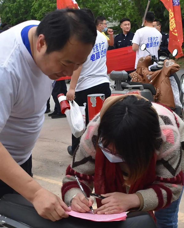 說干就干,第二天一大早,寫有“大廟反詐健步隊”的兩面大旗就在派出所門口豎了起來,2000份反詐宣傳單、1000份反詐承諾書隨即準備完畢。