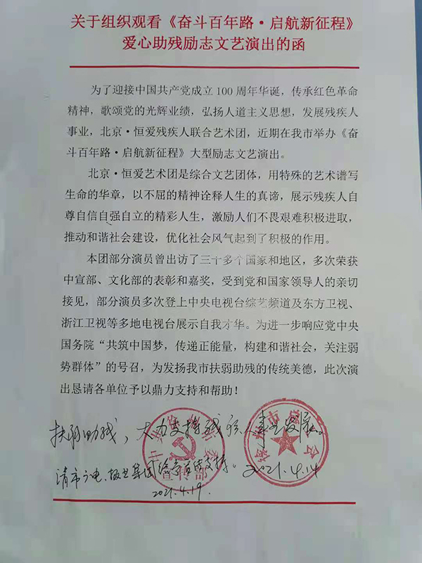 黃淮網(wǎng)  為迎接建黨100周年,傳承紅色革命精神,歌頌黨的光輝業(yè)績,北京•恒愛殘疾人聯(lián)合藝術團大型勵志文藝演出《奮斗百年路 啟航新征程》,將于6月9號晚間7點30分在徐州市音樂廳拉開帷幕。50多名演職人員將帶來舞蹈《龍騰盛世&舞獅》、歌伴舞《春天的故事》、口書表演、疫情詩朗誦《因為有你》、手語舞《唱支山歌給黨聽》等,用特殊的藝術譜寫生命的華章,以不屈的精神詮釋人生的真諦,展現(xiàn)殘疾人自尊自信自強自立的精彩人生,激勵人們不畏艱難,積極進取,推動和諧社會建設。