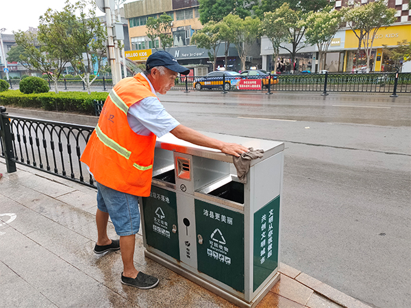 環(huán)衛(wèi)所注意增設(shè)新分類果皮箱與周邊的街景匹配,使果皮箱變得更加靚麗醒目。環(huán)衛(wèi)工人對主次干道兩側(cè)的果皮箱,每日清洗一次,堅(jiān)持全天候保潔,并及時(shí)清運(yùn)收集的垃圾,杜絕發(fā)生果皮箱溢滿現(xiàn)象,有效改善了城區(qū)環(huán)境衛(wèi)生面貌。環(huán)衛(wèi)工人的行動(dòng)對增強(qiáng)城區(qū)居民環(huán)保意識(shí)和自覺分類投放垃圾起到教育和促進(jìn)作用,提升了城市文明程度和城市品位。