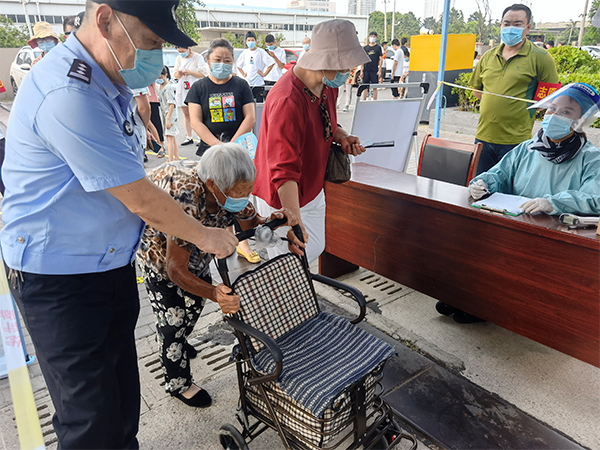在警察爺爺的鼓勵和勸導下,男孩終于張開了嘴巴,順利完成檢測,而湯占國卻在安撫男孩期間不慎扭傷腰部,疼痛不已,已經56歲的他輕傷不下火線,直到第二天核酸檢測工作全部結束才去醫(yī)院就醫(yī)。
