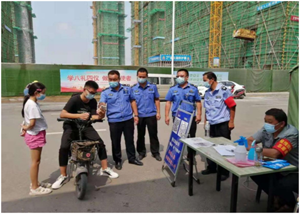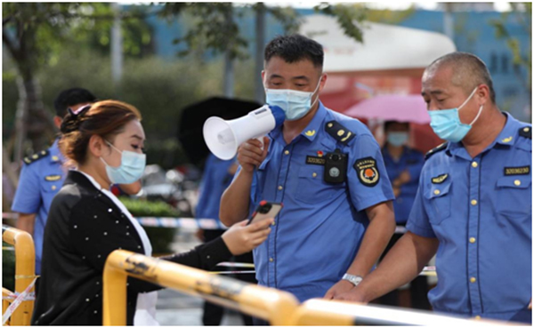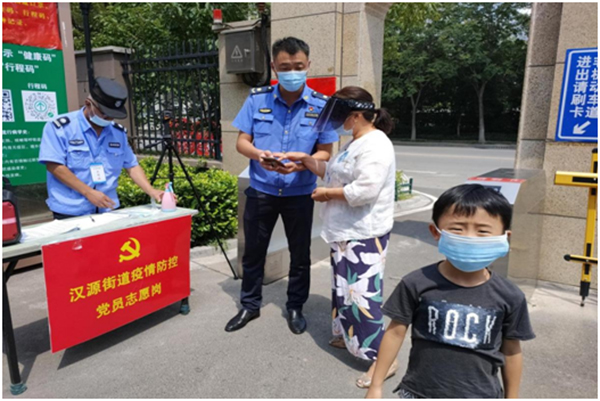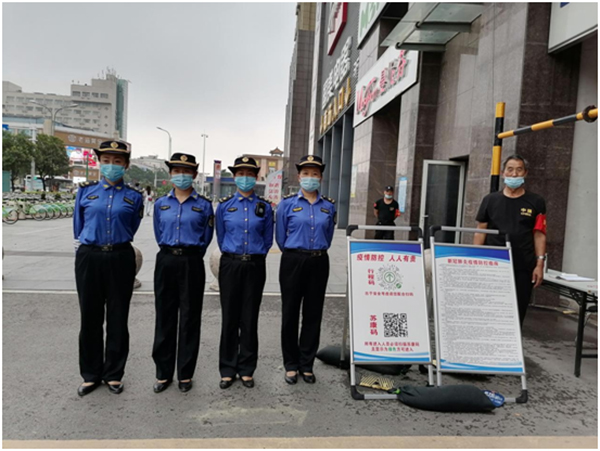 城管執(zhí)法人員認(rèn)真檢查居民健康碼和行程碼