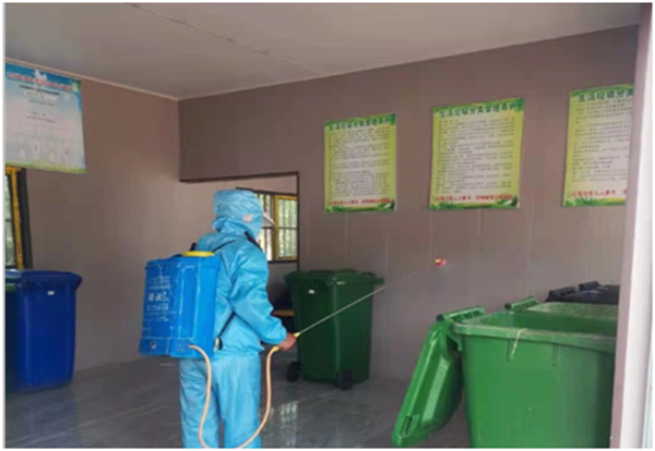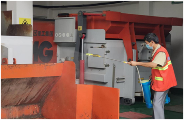 環(huán)衛(wèi)人員對環(huán)衛(wèi)設(shè)施進(jìn)行防疫消殺