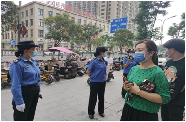 城管執(zhí)法人員向市民宣傳疫情防疫知識