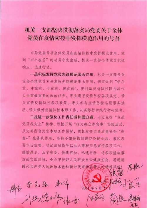 全局黨員干部紛紛表示,要積極響應(yīng)局黨委號(hào)召和支部倡議,迅速把思想統(tǒng)一到局黨委部署上來(lái),將黨史學(xué)習(xí)教育成果轉(zhuǎn)化為做好疫情防控工作的動(dòng)力,發(fā)揚(yáng)敢于斗爭(zhēng)、敢于勝利的強(qiáng)大精神力量,克服麻痹思想、僥幸心理,在“兩在兩同”建新功活動(dòng)中,全力守護(hù)好人民群眾生命健康安全和市場(chǎng)安全,用實(shí)際行動(dòng)譜寫(xiě)新時(shí)代市場(chǎng)監(jiān)管黨員先鋒隊(duì)新風(fēng)采!