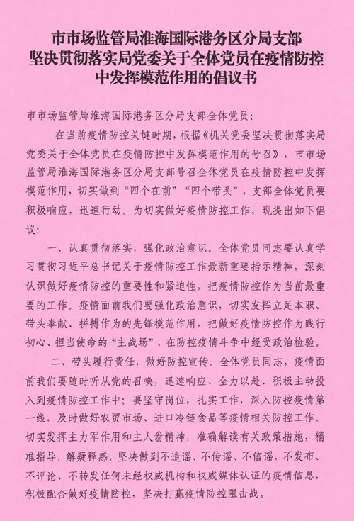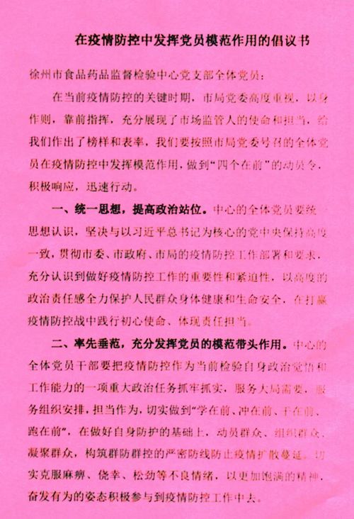 黃淮網(wǎng)(徐仕評(píng) 費(fèi)堅(jiān)真)  “作為市場(chǎng)監(jiān)管戰(zhàn)線的共產(chǎn)黨員,面對(duì)疫情,守護(hù)好人民健康安全是我們每一位黨員責(zé)無(wú)旁貸的重任。我堅(jiān)決響應(yīng)局黨委號(hào)召,聽(tīng)從黨的召喚,沖鋒在疫情防控一線,為黨旗爭(zhēng)光添彩!”這是徐州市市場(chǎng)監(jiān)管局機(jī)關(guān)黨委一支部黨員請(qǐng)戰(zhàn)書(shū)中的錚錚誓言,像這樣的請(qǐng)戰(zhàn)書(shū)在市市場(chǎng)監(jiān)管系統(tǒng)黨員中還有很多很多。