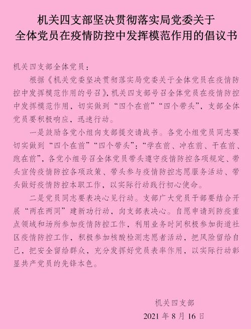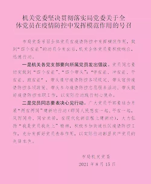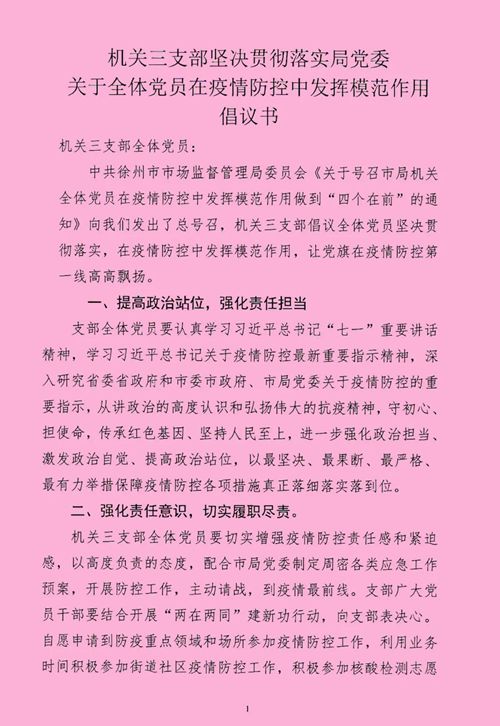 8月12日,徐州市市場(chǎng)監(jiān)督管理局黨委發(fā)布《關(guān)于號(hào)召市局機(jī)關(guān)全體黨員在疫情防控中發(fā)揮模范作用做到“四個(gè)在前”的通知》,號(hào)召全體黨員要在疫情防控中切實(shí)做到“學(xué)在前、沖在前、干在前、跑在前”,帶頭遵守疫情防控各項(xiàng)規(guī)定、帶頭宣傳疫情防控各項(xiàng)政策、帶頭參與疫情防控志愿服務(wù)活動(dòng)、帶頭做好疫情防控本職工作,以實(shí)際行動(dòng)踐行初心使命。