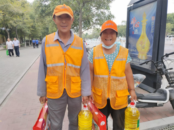 張冠軍表示:感謝您們?yōu)槌鞘械奈拿鹘ㄔO(shè)所做出的貢獻(xiàn),希望通過(guò)此次開展中秋節(jié)慰問(wèn)環(huán)衛(wèi)工人的活動(dòng),倡導(dǎo)社會(huì)各界進(jìn)一步樹立理解、尊重、支持環(huán)衛(wèi)工人的意識(shí),營(yíng)造全社會(huì)關(guān)心關(guān)愛環(huán)衛(wèi)工人的良好氛圍;也希望廣大環(huán)衛(wèi)工人再接再厲,干好本職工作時(shí)注意安全,確保身體健康和安全生產(chǎn)兩不誤,以更強(qiáng)的責(zé)任心和使命感,勇挑重?fù)?dān),為沛縣人民創(chuàng)造更加干凈整潔的衛(wèi)生環(huán)境。祝大家身體健康,平安快樂(lè)!