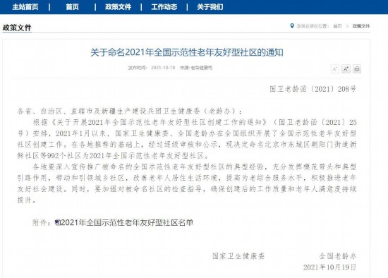 我蘇網(wǎng)訊10月19日,國(guó)家衛(wèi)生健康委、全國(guó)老齡辦發(fā)布《關(guān)于命名2021年全國(guó)示范性老年友好型社區(qū)的通知》,根據(jù)《關(guān)于開(kāi)展2021年全國(guó)示范性老年友好型社區(qū)創(chuàng)建工作的通知》(國(guó)衛(wèi)老齡函〔2021〕25 號(hào))安排,2021年1月以來(lái), 國(guó)家衛(wèi)生健康委、全國(guó)老齡辦在全國(guó)組織開(kāi)展了全國(guó)示范性老年友好型社區(qū)創(chuàng)建工作。在各地推薦的基礎(chǔ)上,經(jīng)過(guò)逐級(jí)審核和公示,現(xiàn)決定命名北京市東城區(qū)朝陽(yáng)門街道新鮮社區(qū)等992個(gè)社區(qū)為2021年全國(guó)示范性老年友好型社區(qū)。