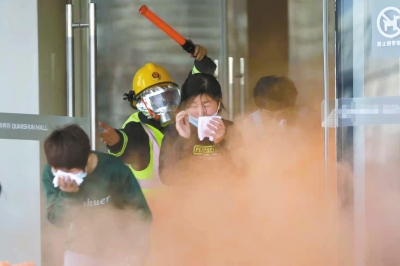 被困人員在消防指戰(zhàn)員的引導(dǎo)下進(jìn)行疏散逃生演練