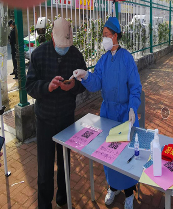 同樣在該社區(qū)參加志愿服務(wù)的劉吉萍同志,她與同為黨員的愛人,雙雙加入志愿者先鋒隊,值守抗疫“一線”,留下上高三的孩子獨自在家備考。4月4日劉吉萍在“黃碼”核酸檢測點執(zhí)勤時,發(fā)現(xiàn)社區(qū)部分老年人雖已符合“黃碼”轉(zhuǎn)“綠碼”的條件,但因不會使用申請返“綠”報備程序,仍然被賦“黃碼”,這既給老人們生活帶來了不便,也給防疫排查增加了難度。了解情況后,劉吉萍主動請纓,熱心幫助居民群眾辦理轉(zhuǎn)碼網(wǎng)上申報。就這樣,她在“黃碼”核酸檢測點一站就是5個多小時,不畏風(fēng)險、不辭辛苦,為居民提供貼標(biāo)登記、轉(zhuǎn)碼咨詢服務(wù)500余人次,用愛心和責(zé)任表現(xiàn)出“巾幗不讓須眉”的擔(dān)當(dāng), 成為戰(zhàn)“疫”大軍中的一道靚麗風(fēng)景。