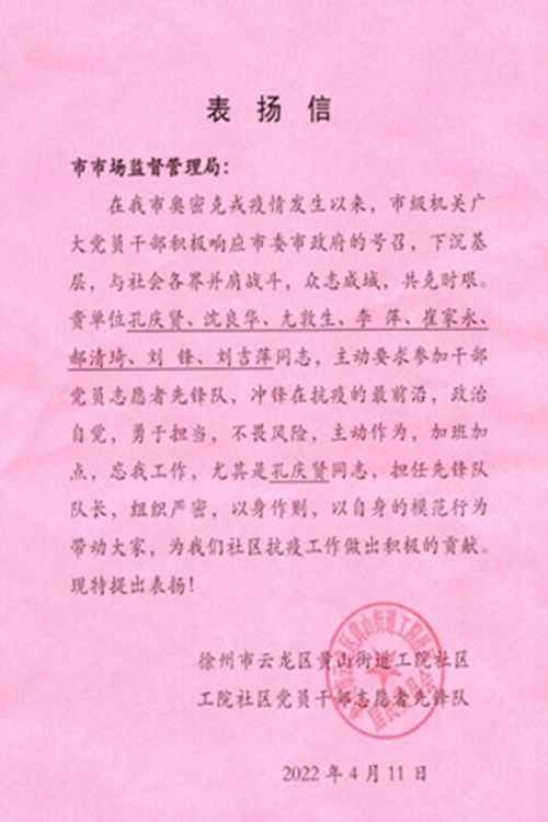防疫攻堅“我”先行 筑牢防線勇?lián)?dāng)--徐州市檢驗檢測中心防疫志愿者收到表揚信