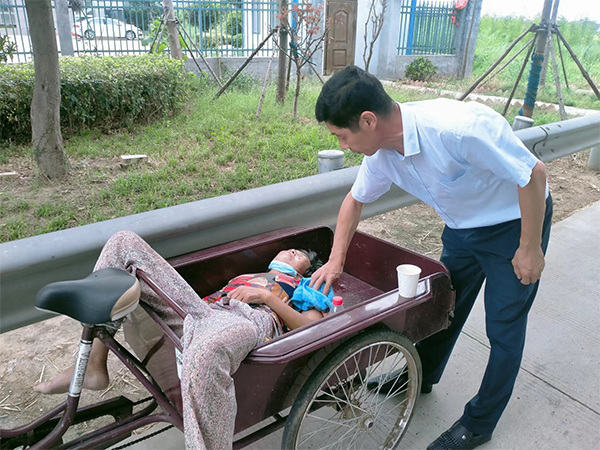 6月26日下午14:55左右,一位60多歲的老太太騎車行至豐沙公路豐縣收費站收費大棚下時,終因高溫中暑體力不支暈倒在自己騎的腳蹬三輪車?yán)铮⒍伦×藦纳綎|魚臺至豐縣歡口鎮(zhèn)的人行道路。值班站長李珂接到當(dāng)班監(jiān)控員卜文麗報告后立即和值班員張明軍前往查看。發(fā)現(xiàn)老人躺在三輪車?yán),兩腿耷拉在車外,李珂試圖喊醒老人問明情況,但老人一直沒有反應(yīng)。此時正值高溫時段,李珂怕老人病情加重,一邊和聞訊前來的當(dāng)班收費隊長侯先超、副隊長王濤將老人推到樹蔭下,又拿來濕毛巾為老人擦拭降溫,并端來溫開水讓老人飲用。見老人呼吸仍然非常微弱,其身上又無手機無法聯(lián)系其家人,李珂立即撥打120急救電話。在等待120救護(hù)車到來之前,李珂等人不停地用濕毛巾為老人擦拭身體、喂水,120救護(hù)車來到后又向救護(hù)人員介紹了老人的情況,并幫助救護(hù)人員將老人抬上了救護(hù)車,為老人病情的及時救治贏得了寶貴的時間。