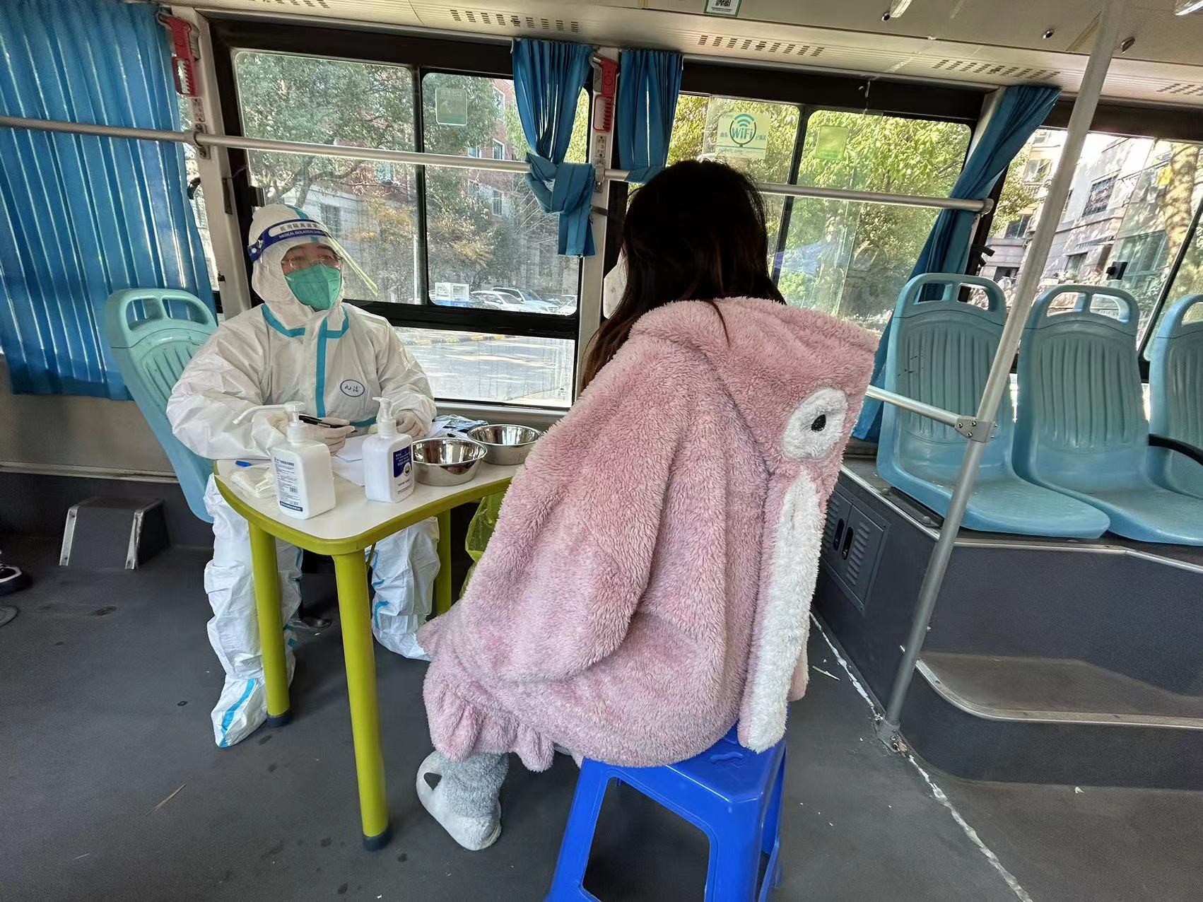 前門上車,在臨時(shí)就診臺(tái)測(cè)溫、登記、問(wèn)診,拿到處方單往后走到“藥房”,醫(yī)?ǜ犊钊∷,從后門下車。這是一輛由公交車改造的發(fā)熱流動(dòng)診療車,趙歐今天一早在車上看病取藥的整個(gè)過(guò)程不到十分鐘。