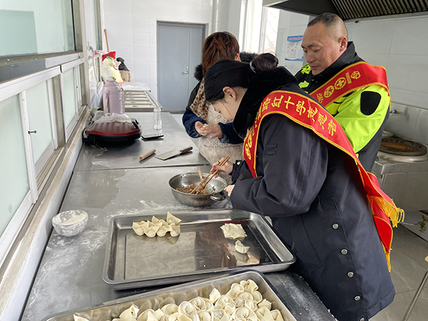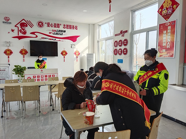 暖心服務四:黨員志愿者為司乘人員提供暖心的服務。有些貨車司機著急趕路,中午只做短暫休息,連午飯都沒有時間,為讓司乘人員吃上一口熱乎飯,公路志愿者們親自包餃子,真誠的服務讓更多駕乘人員感受到家的溫暖,得到過往群眾的一致好評。