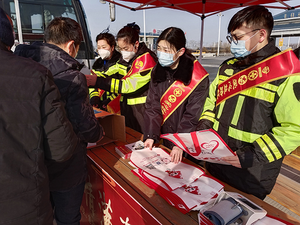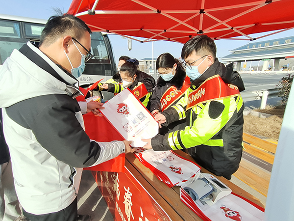 暖心服務二:志愿者們?yōu)檫^往司乘人員免費提供熱水,泡面,免費移動充電,路況查詢,測量血壓等一系列便民服務,讓更多的駕乘人員感受到滿意的熱情服務。