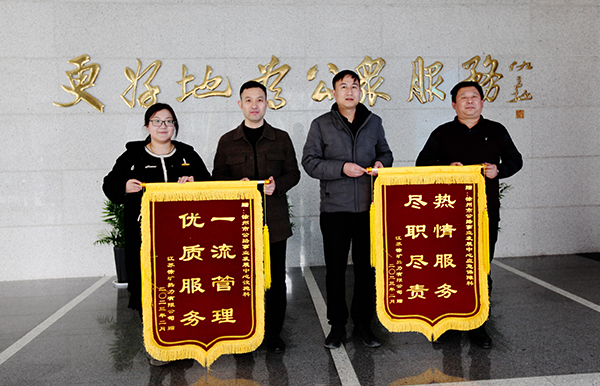黃淮網(wǎng)(主欽珂) 2月24日,江蘇省徐礦熱力有限公司相關(guān)負責人將“一流管理 優(yōu)質(zhì)服務(wù)”“熱情服務(wù) 盡職盡責”兩面錦旗送到徐州市公路事業(yè)發(fā)展中心工作人員手中,對公路中心設(shè)施科、應(yīng)急保障科在辦理涉路工程許可中提供熱情周到的技術(shù)服務(wù),表示了衷心感謝。