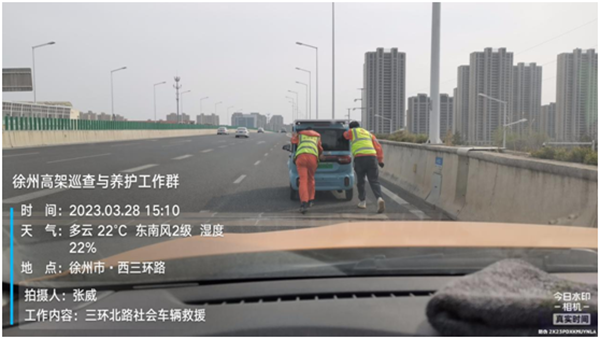 黃淮網(wǎng)(張媛) 3月28日,徐州市公路部門金環(huán)公路工程有限公司何兵、張威、孫學義三人在西三環(huán)進行日常巡查,途徑蘇山地道時發(fā)現(xiàn)前方上坡處有一輛電動代步車正在緩慢行駛,駕駛室內(nèi)的老人面露難色,車前方還站著他的老伴。當時車流量較大,旁邊車輛呼嘯而過,情況十分危險,巡查員迅速下車了解情況,并設(shè)置臨時安全防護措施。