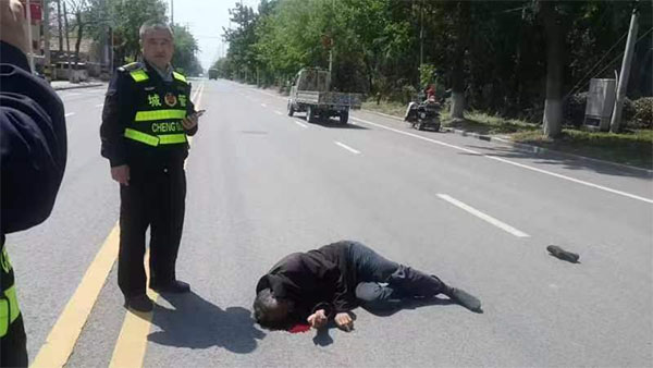 當(dāng)天,徐華臨和其他執(zhí)法人員與往常一樣開展日常巡查,當(dāng)巡查至漢興路北頭時(shí),發(fā)現(xiàn)有人聚集,走近一看發(fā)現(xiàn)竟有一名老人橫在馬路中間,一輛電動(dòng)三輪車側(cè)翻在一旁,老人鮮血直流痛苦呻吟。事發(fā)時(shí)間段,過(guò)往車輛行人比較少,圍觀的群眾也無(wú)人敢上前。