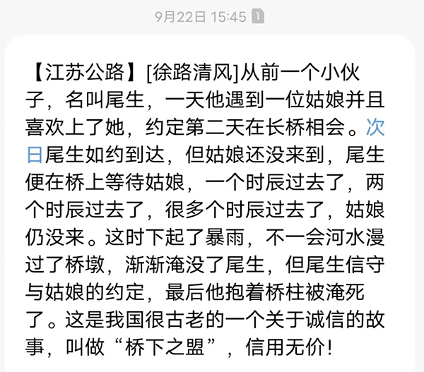 開展“誠實(shí)守信,一路暢行”主題宣傳活動(dòng);顒(dòng)期間通過機(jī)關(guān)LED大屏、服務(wù)區(qū)、收費(fèi)站橫幅等多種形式進(jìn)行“誠實(shí)守信,一路暢行”主題宣傳;利用江蘇公路內(nèi)網(wǎng)郵件系統(tǒng)《徐路清風(fēng)》板塊,向廣大干部職工發(fā)送誠實(shí)守信小故事及警示格言,積極營造濃厚的活動(dòng)氛圍。