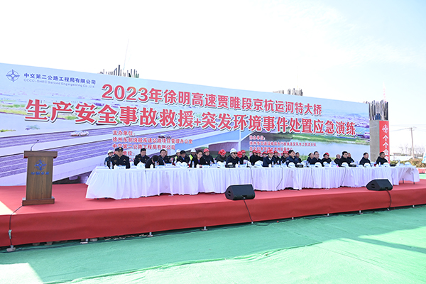 本次演練由徐州東部繞越高速公路項目管理辦公室與中交第二公路工程局有限公司聯(lián)合主辦,徐州東部繞越高速公路XM-TJ6標項目經理部承辦,徐州市交通運輸綜合行政執(zhí)法支隊水上執(zhí)法大隊等5家單位協(xié)辦,徐州市交通運輸局、徐州市賈汪區(qū)人民政府等8家單位觀摩。