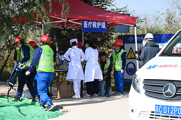 生產安全事故救援演練模擬京杭運河特大橋南岸主墩左幅掛籃頂推施工過程中,頂推油缸一處油管突然爆裂,刺傷1名作業(yè)人員眼睛。項目部立即啟動機械傷害專項應急預案二級響應,同時聯(lián)系簽訂綠色救援協(xié)議的醫(yī)療機構,按照“三免三優(yōu)先”原則派出醫(yī)護人員救治受傷人員。