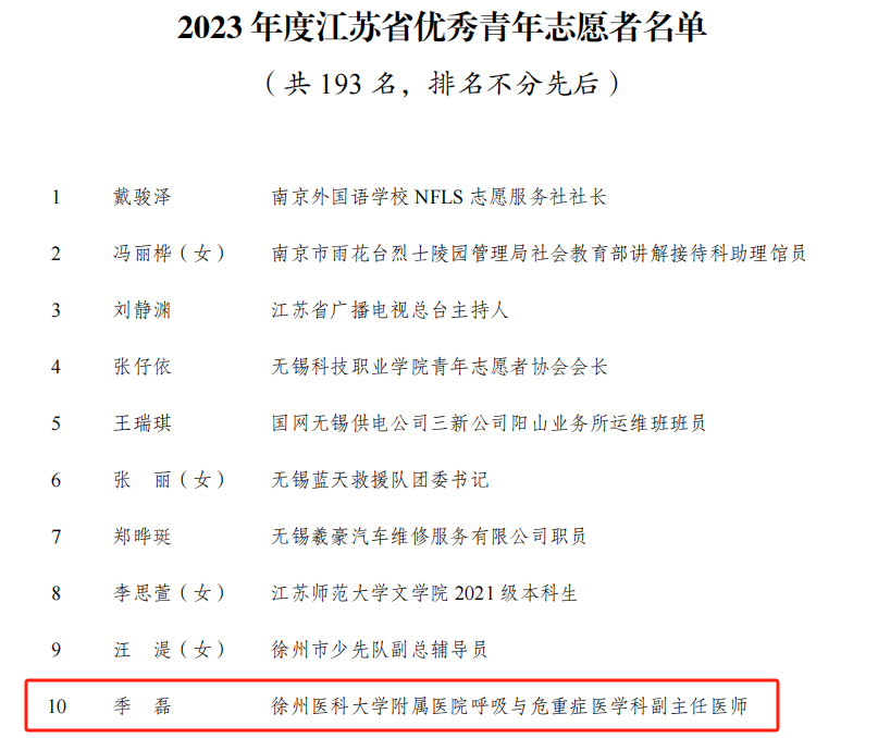 黃淮網(wǎng) 近日,共青團(tuán)江蘇省委、共青團(tuán)徐州市委先后組織開展了青年志愿者行動先進(jìn)典型評選,徐州醫(yī)科大學(xué)附屬醫(yī)院呼吸與危重癥醫(yī)學(xué)科季磊榮獲“江蘇省優(yōu)秀青年志愿者稱號”,急診醫(yī)學(xué)科趙明階榮獲“徐州市優(yōu)秀青年志愿者”稱號。