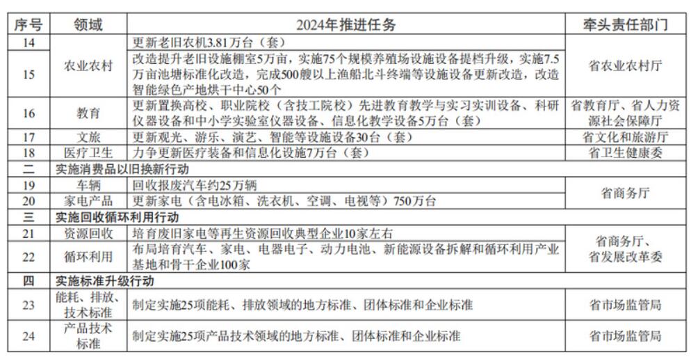 江蘇省政府近日印發(fā)《江蘇省推動大規(guī)模設(shè)備更新和消費品以舊換新行動方案》,力爭到2027年,工業(yè)、建筑、交通、農(nóng)業(yè)、科教、文旅、醫(yī)療、能源環(huán)境等領(lǐng)域設(shè)備投資規(guī)模較2023年增長30%左右;重點行業(yè)先進產(chǎn)能比重大幅提高,高質(zhì)量耐用消費品市場份額顯著增加,資源回收循環(huán)利用水平持續(xù)提升。