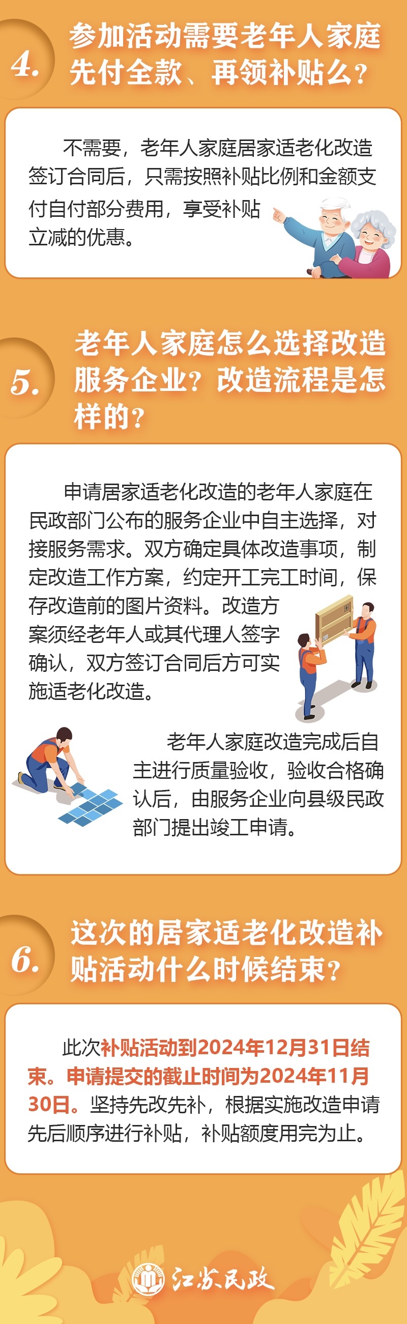 第二步,對(duì)接需求。申請(qǐng)居家適老化改造的老年人家庭在各市、縣民政局公布的服務(wù)企業(yè)中自主選擇,對(duì)接服務(wù)需求。雙方確定具體改造事項(xiàng),制定改造方案,約定開工完工時(shí)間,簽訂合同后可實(shí)施改造。