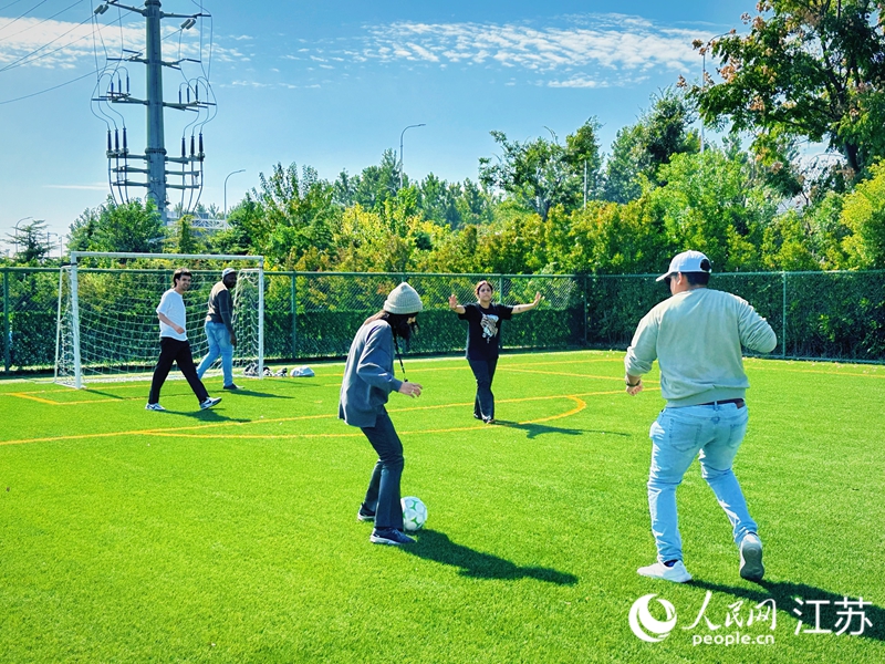 拉美記者在人造草坪上踢足球。人民網(wǎng) 周夢嬌攝