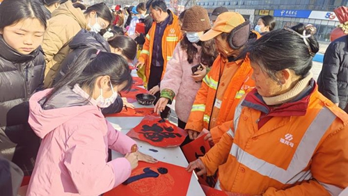 活動(dòng)在九龍城沛公驛舉行,F(xiàn)場墨香四溢,漢源小學(xué)的師生們凝神聚氣,揮毫潑墨,將一幅幅寓意吉祥、內(nèi)容祥和的春聯(lián)和飽含神韻的“福”字躍然紙上。這些春聯(lián)不僅彰顯了傳統(tǒng)書法的魅力,更寄托了人們對新一年的美好祝愿。城管局的工作人員和學(xué)校的師生們一起,將這些春聯(lián)和“福”字晾干后,親手送到現(xiàn)場的環(huán)衛(wèi)工人和市民朋友手中。市民們臉上洋溢著幸福的笑容,紛紛表示,這些手寫的春聯(lián)更有意義,更有年味。