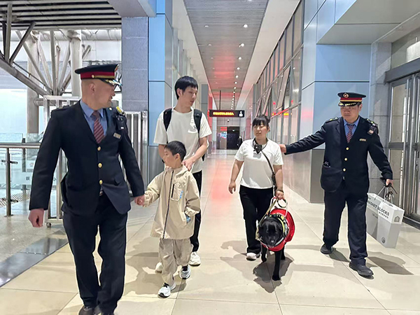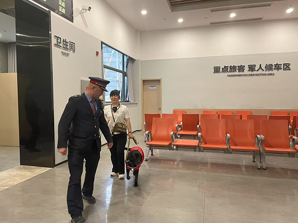 當(dāng)天,徐州站迎來(lái)了兩位盲人旅客和一位隨行兒童,他們身旁的導(dǎo)盲犬身姿挺拔,警惕地觀察著周圍的環(huán)境,協(xié)助主人應(yīng)對(duì)復(fù)雜的車站環(huán)境。盡管他們努力表現(xiàn)得鎮(zhèn)定,但不安的神色還是在不經(jīng)意間流露出來(lái)。對(duì)他們而言,每一次出行都是挑戰(zhàn),車站的嘈雜聲、涌動(dòng)的人群,都讓他們的內(nèi)心充滿忐忑。