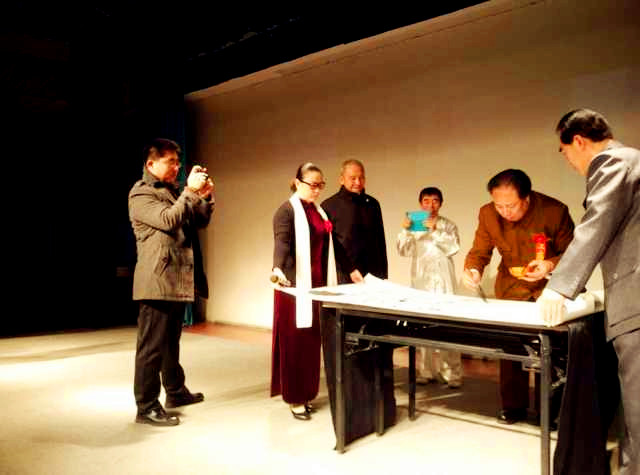 中國黃淮網(wǎng)東三省采編劉德明應邀參加。演出中,偉人毛主席扮演者王得喜現(xiàn)場潑墨,寫下了氣勢磅礴的毛澤東著名詩詞【沁園春·雪】。現(xiàn)場氣氛非常熱烈,在一片“毛主席萬歲!”的歡呼聲中,把整個演出推向高潮。