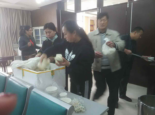領導員工齊上陣、有的小心翼翼地扶他們上衛(wèi)生間、有的給大家發(fā)飯,各負其責!考慮到他們上下樓不方便,就讓他們統(tǒng)一在各自的座位上就餐。