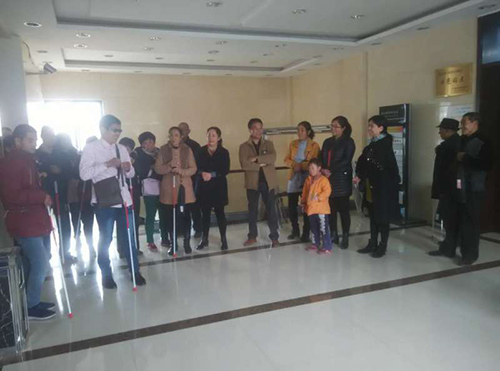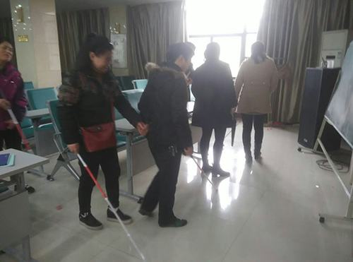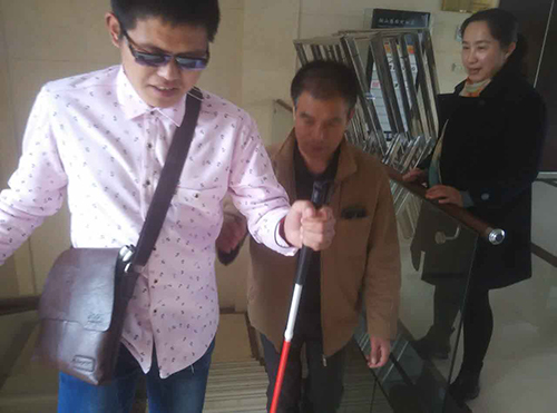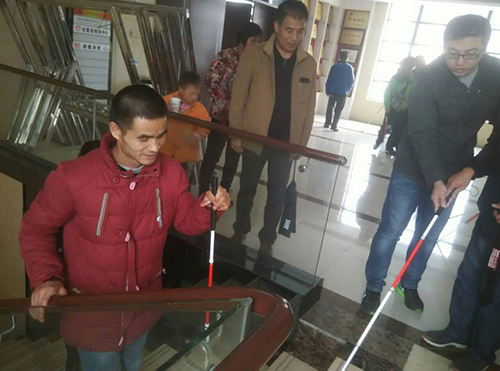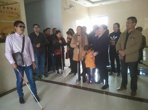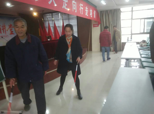 吃完午飯,稍微休息片刻,下午13:30大家在指導老師劉桂榮的引領下,如何正確使用盲杖進行實戰(zhàn)演練,大家有條不紊地排成隊,練習規(guī)范行走。比如:邁左腳,盲杖傾斜四十五度向右點,邁右腳,盲杖傾斜四十五度向左點,離地面2厘米,腳站穩(wěn)后再走第二步。