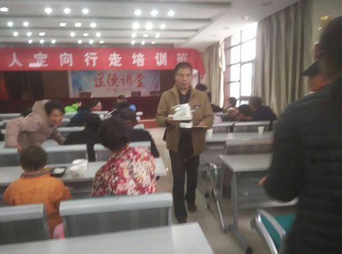 12點10分課程剛結束,殘聯的領導和員工們早已備好香噴噴的飯菜,土豆片炒肉、米粉肉、紫菜蛋湯大米飯加饅頭每人一份。