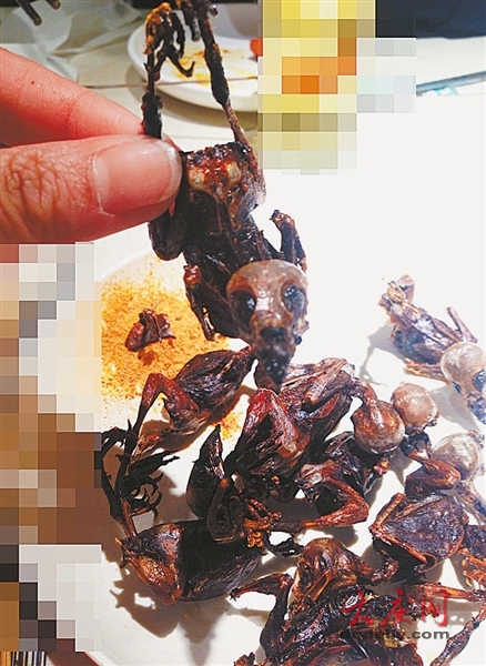 5月10日,記者來到該飯店,對此進行暗訪。服務(wù)員告訴記者,鐵雀是一種小鳥,干炸鐵雀每盤售價為32元,每盤約有8只左右。