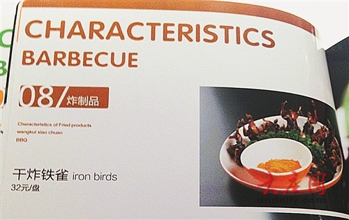 點菜的時候,劉先生發(fā)現(xiàn)在這家飯店的菜單的“炸制品”中竟然有“干炸鐵雀”,而且旁邊還配了照片。朋友見劉先生盯著菜單上的這道菜,以為他想吃,便想跟服務(wù)員點這道菜,但被劉先生制止了。