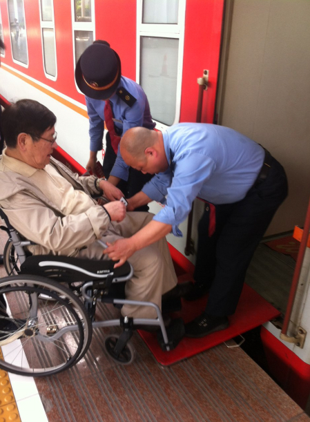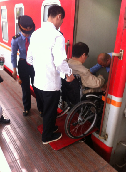 本網(wǎng)鄭州5月20日訊(采編/銀合軍)5月16日,由鄭州客運(yùn)段擔(dān)當(dāng)?shù)纳虾V拎嵵莸腒152次列車在上海站放行。身體嚴(yán)重殘疾、幾乎不能單獨(dú)直立行走的旅客王曉波同伴抬進(jìn)了車廂。
