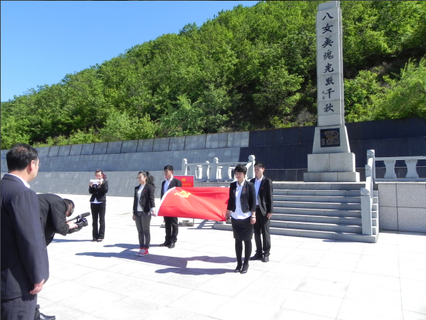 經(jīng)過一個(gè)半小時(shí)的路程,到達(dá)了林口縣刁翎鎮(zhèn)三家子村的烏斯渾河畔,遠(yuǎn)遠(yuǎn)望去,群山綠水中一座高高的烈士紀(jì)念碑貯立在山腳下,豎書“八女英魂光照千秋”八個(gè)大字。碑的左面是烈士紀(jì)念館,威嚴(yán)聳立。全體黨員正襟下車,刁翎鎮(zhèn)政府領(lǐng)導(dǎo)熱情接待了我們,懷著沉重的心情,我們登上臺階。在烈士紀(jì)念碑前再次宣讀入黨誓詞,以黨委書記崔鵬為主的全體黨員語調(diào)激昂,精神振奮,八女英魂尤在,壯志尚存。