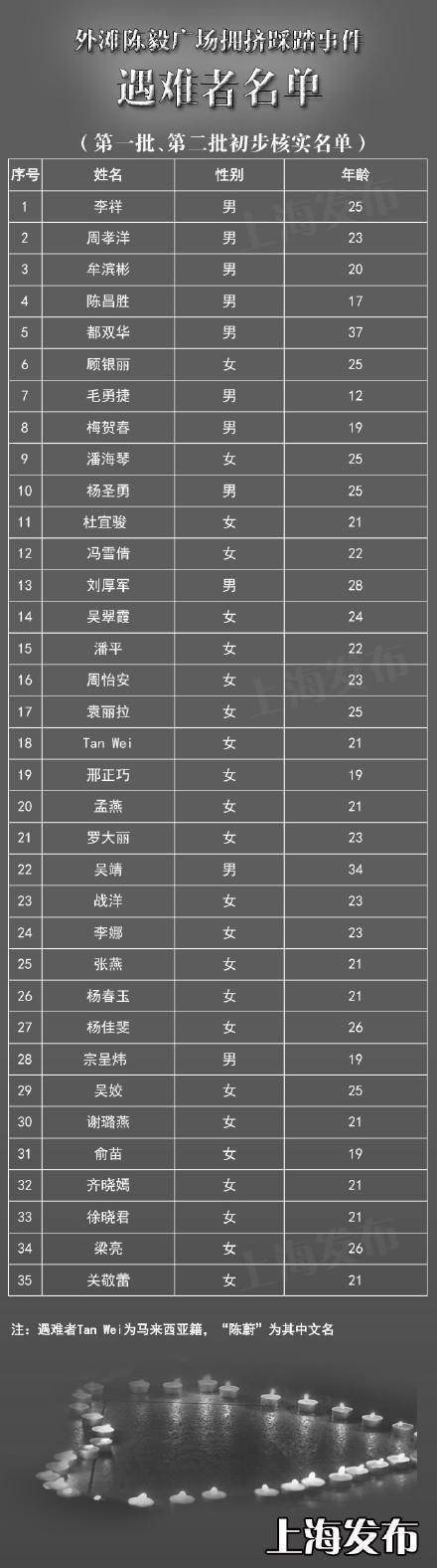 昨天,上海外灘踩踏事件36名遇難者中,已有35人的身份初步核實。截至昨天16時,又有2名傷員出院,住院治療的還有重傷10人,輕傷19人。