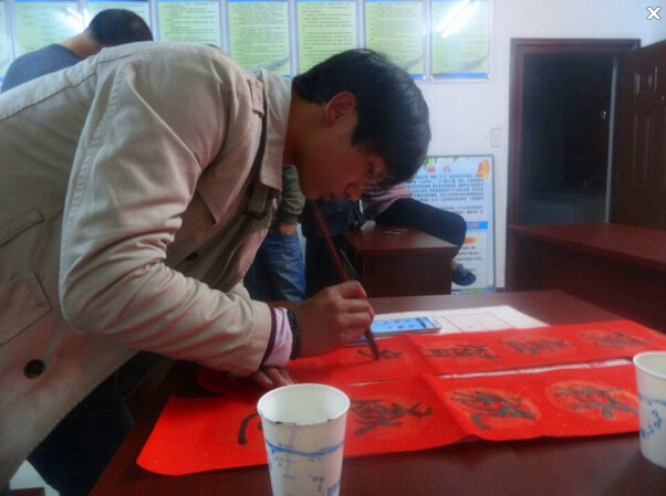 只見車間點(diǎn)名室人頭攢動(dòng)熱鬧非凡。原來(lái),今天是新職工在揮毫潑墨書寫春聯(lián)送祝福。最讓大家翹首以盼的是車間號(hào)稱秀才的紅毛(徐潤(rùn)澤),只見他凝神靜氣,揮毫潑墨,一副副歌頌生活、祝福吉祥的春聯(lián)躍然紙上或飄逸,或端莊;鸺t的春聯(lián),淡淡的墨香。使得眾人拍手叫好!