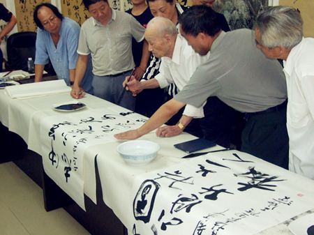 整個(gè)活動(dòng)緊張有序,前來(lái)索取墨寶的新老戰(zhàn)士、老干部家屬絡(luò)繹不絕,書(shū)畫(huà)家們發(fā)揚(yáng)連續(xù)作戰(zhàn)精神,凡來(lái)者盡量滿足需求,受到廣大官兵的鼓掌歡迎。王岳漢,王興文兩位老人不顧年事已高,手不輟筆,如筆走龍蛇,一幅幅書(shū)法精品被激動(dòng)萬(wàn)分的戰(zhàn)士小心翼翼的捧走。在大家的一致勸慰下,兩位老人才勉強(qiáng)坐下休息了一兒。